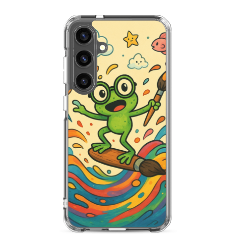 A vibrant cartoon illustration featuring a tiny frog surfing on a floating paintbrush through swirling waves of colorful paint, surrounded by playful mini creatures. A fun, artistic, and whimsical design full of motion and charm.