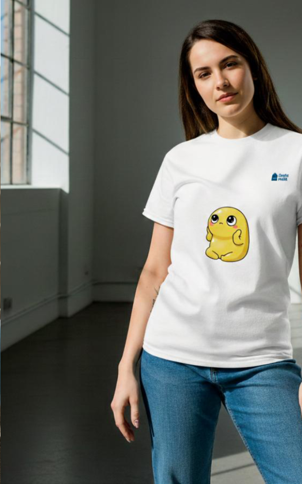 Meet Gloob, a bright yellow, oversized-headed creature with tiny limbs and impossibly expressive eyes. Gloob’s head is so large it seems almost too heavy for his small body, a visual metaphor for all the thoughts, ideas, and what-ifs that constantly swirl around in his mind. In this design, Gloob sits front and center, lost in the endless cycle of thinking. His small body barely grounds him, emphasizing the contrast between his enormous inner world and the simplicity of the quiet, empty space around him. Rendered in a minimalist cartoon style, Gloob’s bright yellow hue dominates the shirt, immediately catching the eye. Soft gradients and clean outlines keep the focus on his expressive face, with just enough detail in his oversized features to communicate both humor and depth. The minimal background ensures the viewer’s attention remains on Gloob’s exaggerated braininess and whimsical struggle to make sense of his thoughts. Perfect for anyone who has ever felt “too much in their head”. Gloob reminds us: it’s okay to have a big brain, even in a small world.